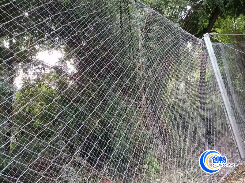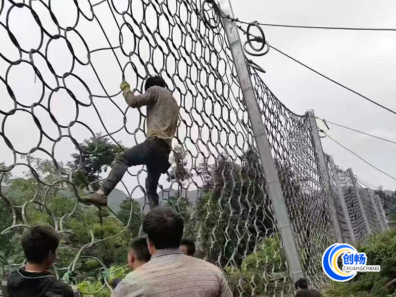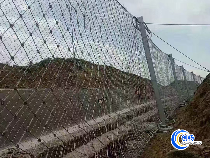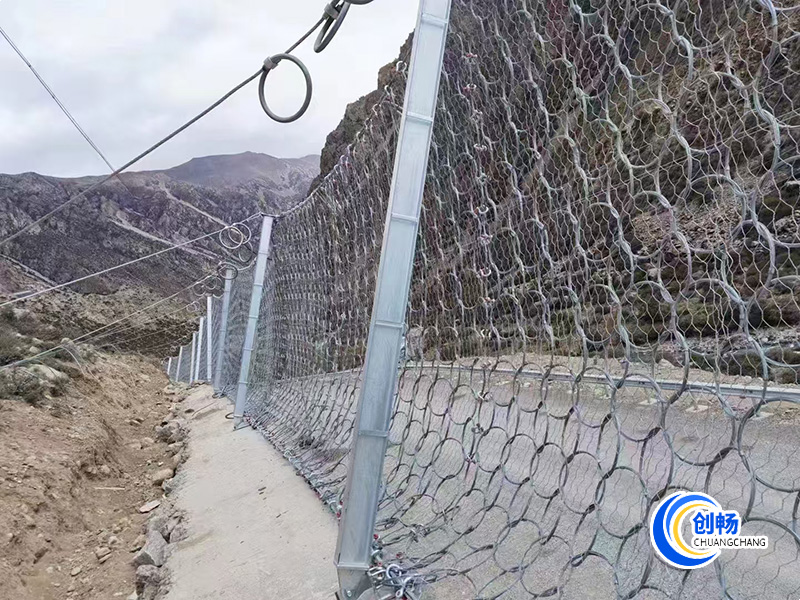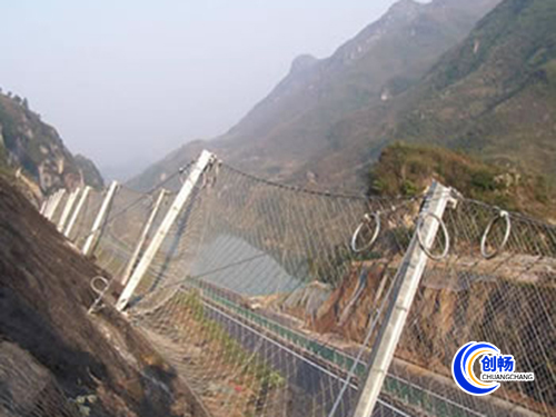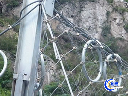 鋼絲繩網(wǎng)、支撐繩和減壓環(huán)構(gòu)造:由鋼絲繩網(wǎng)或環(huán)形網(wǎng)(需攔截小塊落石時(shí)附加一層鐵絲格柵)、固定系統(tǒng)(錨桿、攔錨繩、基座和支撐繩)、減壓環(huán)和鋼柱四個(gè)主要部分構(gòu)成。